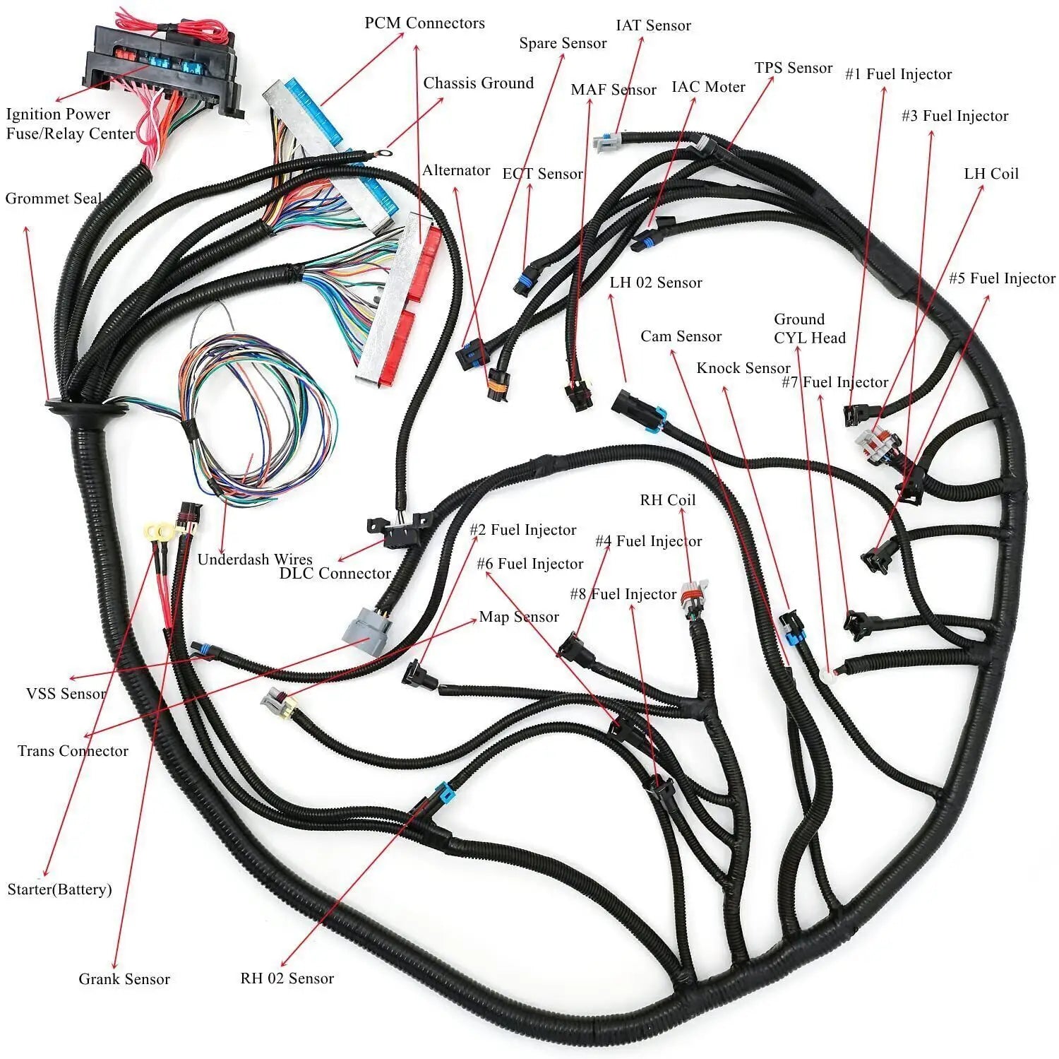 High-quality LS swap harness with full dash connections. Slides easily for PCM mounting under the dash. GM color-coded, reinforced terminals, 1200°F fiberglass braid. Includes connections for IAC, TPS, MAF, MAP, sensors, coils, fuel injectors, and more.